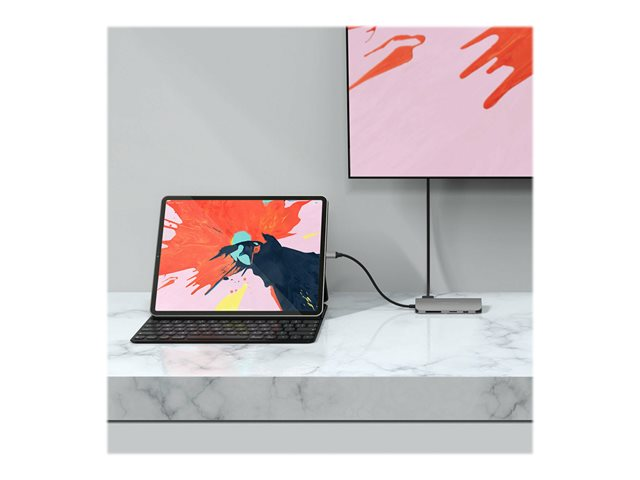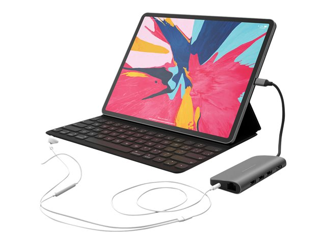 Optimisé pour l'iPad Pro 2018. Permet au hub de reposer à plat sur la surface de la table lorsqu'il est connecté à l'iPad Pro.