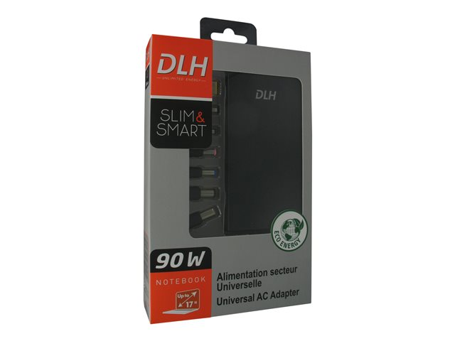 Description du produit DLH - adaptateur secteur - 90 Watt Type de périphérique Adaptateur secteur - externe Tension d'entrée CA 100/240 V Tension de sortie 19 V Capacité d'alimentation 90 Watt Accessoires inclus 7 embouts d'alimentation d'ordinateur portable Couleur Noir Garantie du fabricant Garantie de 2 ans -