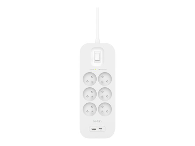 Description du produit Belkin Connect - protection contre les surtensions - avec ports USB-C et USB-A Type de périphérique Protection contre les surtensions - externe Longueur du cordon 2 m Tension d'entrée AC Connecteurs de sortie 6 x power CEE 7/7 (anti-surtensions)