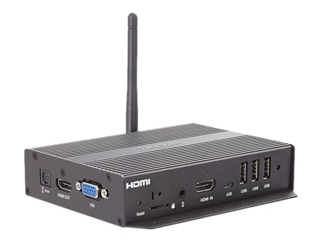 Description du produit ViewSonic NMP580-W - lecteur de signalisation numérique Type de périphérique Lecteur de signalisation numérique Dimensions (LxPxH) 13.86 cm x 12.81 cm x 3.02 cm Processeur Rockchip RK3188 Mémoire flash intégrée 8 Go Cartes mémoire flash prises en charge microSD Résolution de sortie 1080p Système d'exploitation fourni Android 4.4 Interface sans fil IEEE 802.11b/g/n -
