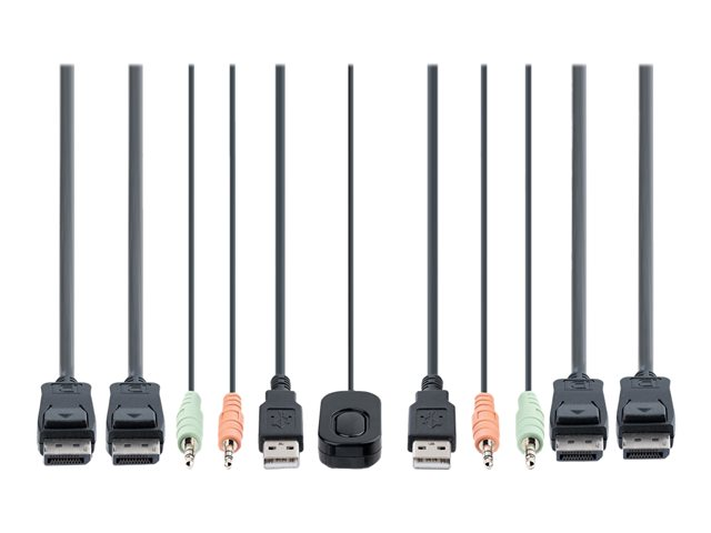 Ce commutateur KVM à deux moniteurs permet aux utilisateurs de basculer entre deux ordinateurs de bureau compatibles USB-A et DisplayPort, en partageant deux moniteurs DisplayPort 4K 60 Hz, un clavier et une souris, ainsi que des périphériques d'entrée/sortie audio.